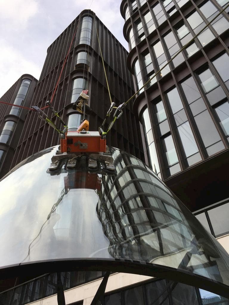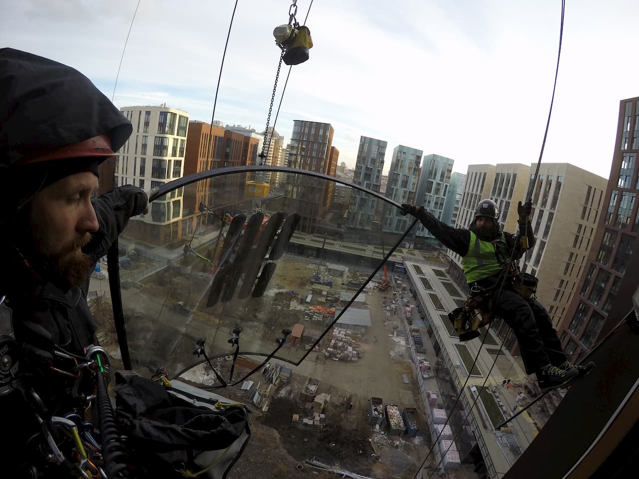 Начиная с 2018 года мы производим монтаж и замену малированных стеклопакетов на ЖК “Садовые кварталы” по средствам канатного доступа. Всем известно что стекло очень хрупкий материал, с которым надо быть предельно осторожным. Часто бывает что радиус проема и радиус стеклопакета не совпадают, наш опыт позволяет совместить радиусы без повреждений и аккуратно позиционировать изделие в проектное положение. Благодаря слаженной работе команды и сертифицированному оборудованию все монтажи и подъемы прошли успешно.