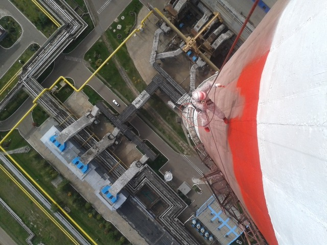 Данная работа начинается с подъема краски и оборудования на технические площадки. Вес краски составлял порядка 800 кг. Каждое утро начиналось с разминки, ведь подъем на трубу по пожарной лестнице занимал порядка часа. Так же свои коррективы вносит погода, порой приходилось работать за облаками. Благодаря четкой организации и продуманному плану выполнение этого проекта заняло 10 рабочих дней силами 4х человек.