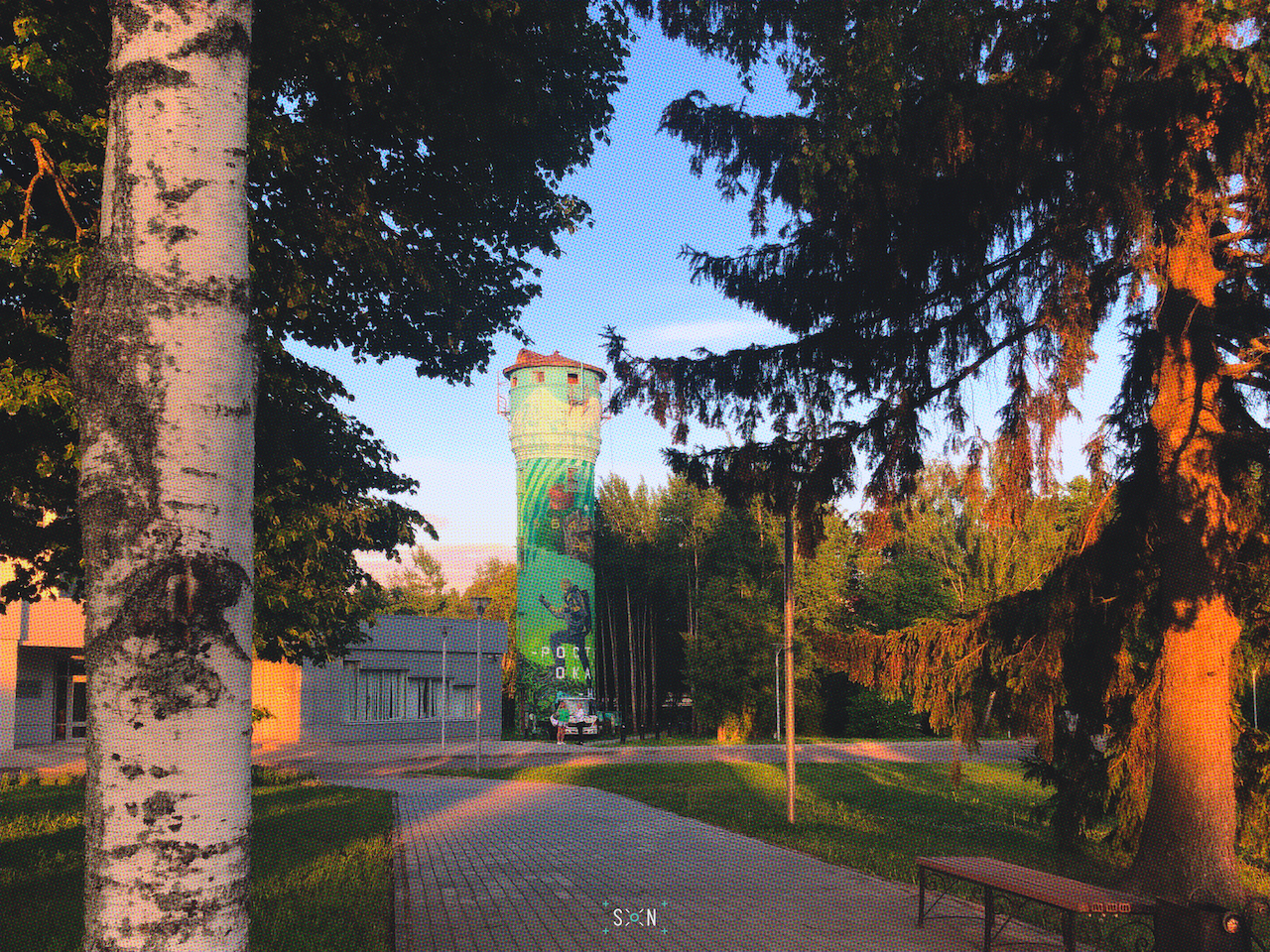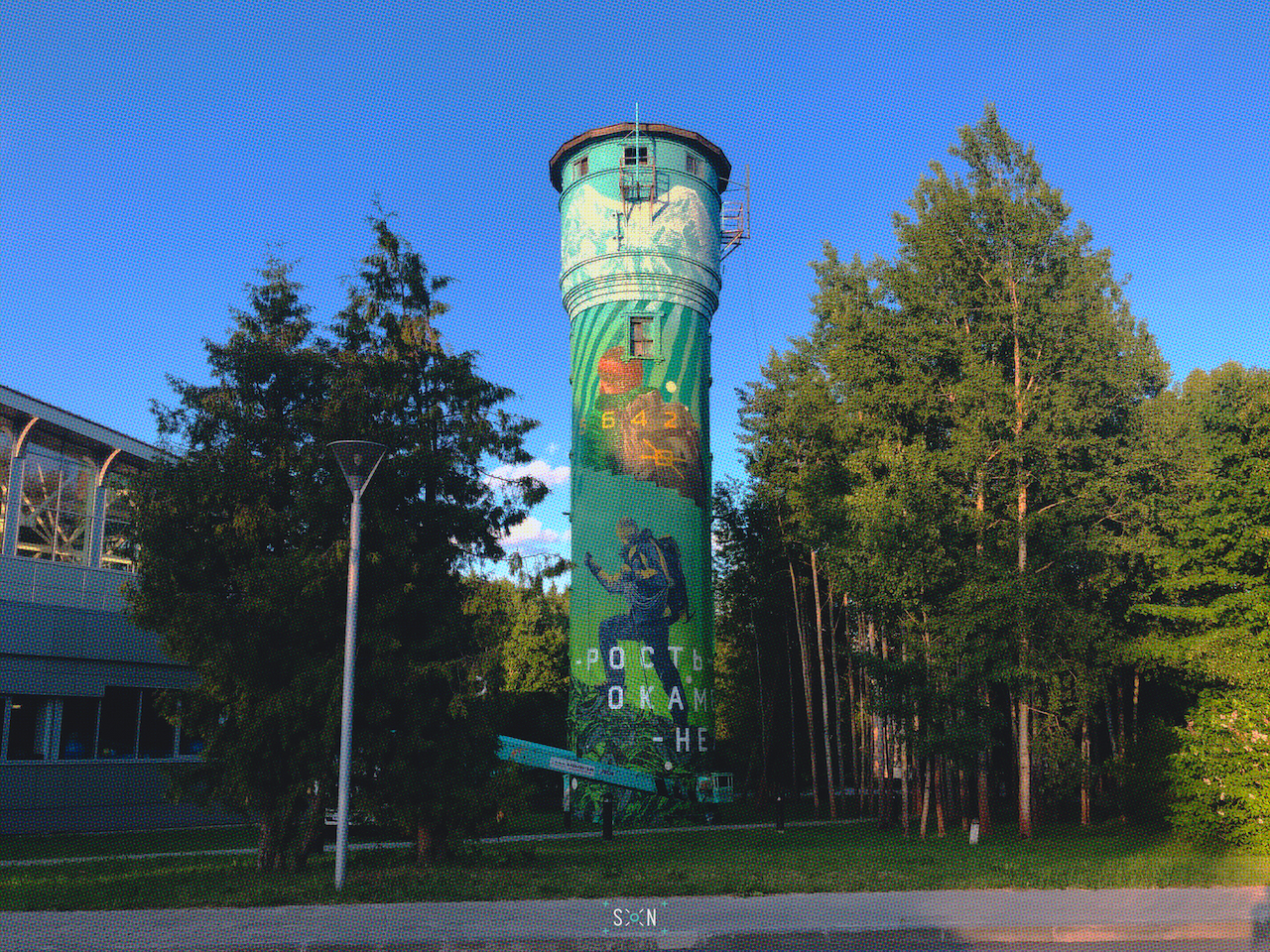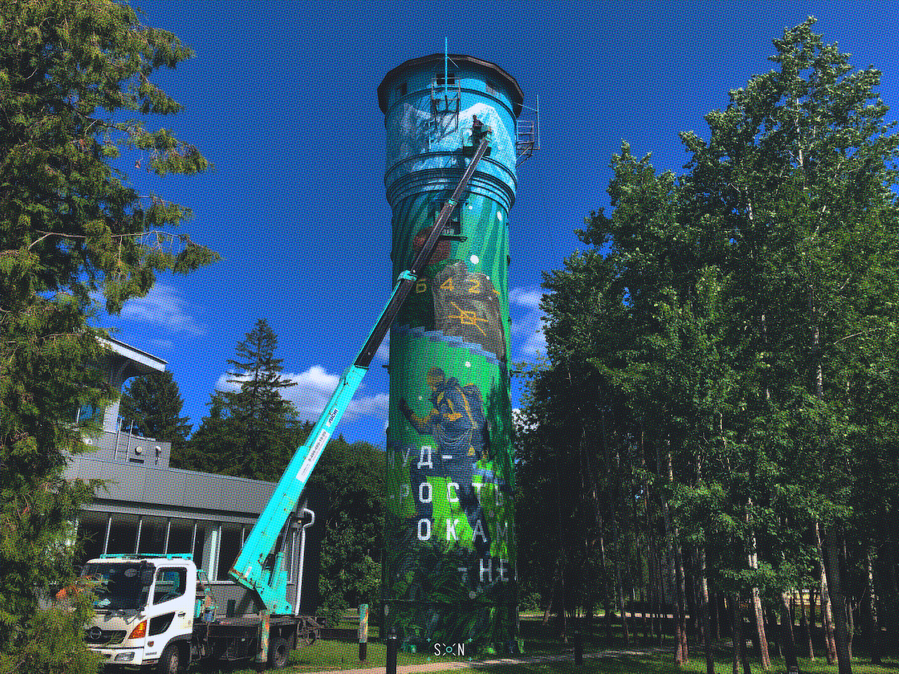 Наш друг Дмитрий Кудинов основатель компании “supernovanet” занимающийся росписью фасадов зданий (граффити) и оформлением различных арт объектов, регулярно приглашает нас для создания “холста” под его картины. Не исключением оказалась и водонапорная башня в Солнечногорске. Используя наше оборудование и опыт в безвоздушной покраске, Башня была загрунтована, покрашена в белый, затем раскрашена с плавными переходами цвета от зеленого до голубого за один день. Дальше свою работу начал художник! Башня заняла первое место в международном конкурсе.